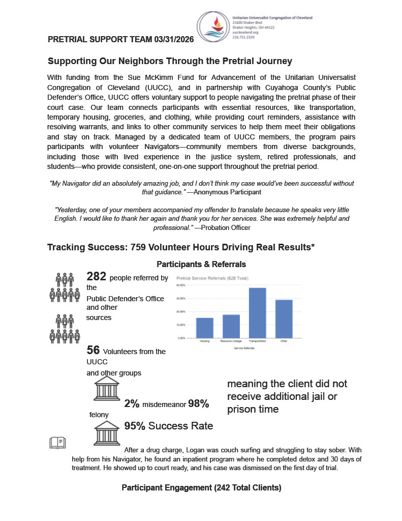 Congratulations to the wonderful folx who volunteer with our UUCC Pretrial Support Team. Our volunteers have helped people succeed through their pretrial period, providing phone reminders, arranging transportation by bus or Uber, childcare, plus referrals to community services.